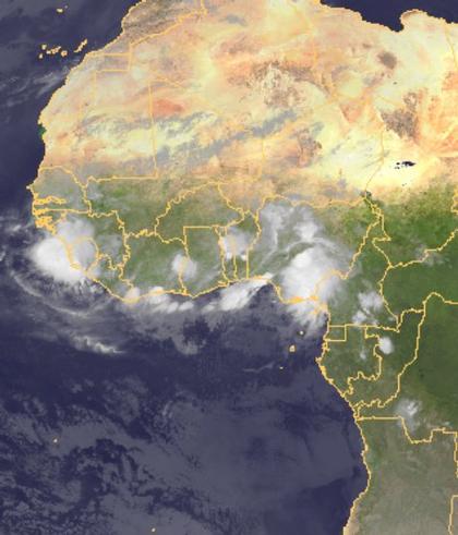 Über Westafrika haben sich jahreszeitlich bedingt kräftige Schauer und Gewitter entwickelt. Die Zellen dieser konvektiven Wolken sind im Satellitenbild sehr gut zu erkennen.