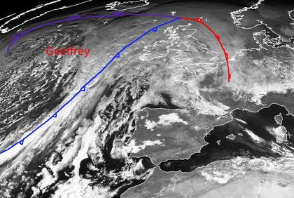 Am Dienstag Mittag liegt die Bewölkung der Warmfront von Tief 'Geoffrey' über Nordfrankreich und östlich der Britischen Inseln. In den Abend- und Nachtstunden überquert sie mit leichten Regen auch Deutschland. Westlich von Großbritannien befindet sich dagegen ein langgestrecktes Wolkenband, das zur Kaltfront von 'Geoffrey' gehört. Auch die Okklusion liegt noch weit auf dem Atlanitk hinaus. Auf der Rückseite des Frontensystems, das sich nun in westlicher Richtung und damit auch über Deutschland weiterbewegt, findet sich typische Schauerbewölkung. (Bildquelle: NERC Satellite Receiving Station, Dundee University, Scotland, http://www.sat.dundee.ac.uk/)
