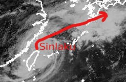 Taifun 'Sinlaku' ist heute Morgen MEZ mit seinem Auge über den äußersten Norden Taiwans hinweggezogen. Dabei hatte er noch durchschnittliche Windgeschwindigkeiten um 130 km/h in Böen um 160 km/h. Im weiteren Verlauf dreht der Taifun unter zögernder Abschwächung auf einen nordöstlichen bis östlichen Kurs. Voraussichtlich wird er in der Nacht zum Montag mitteleuropäischer Zeit zu einem tropischen Sturm abgestuft.