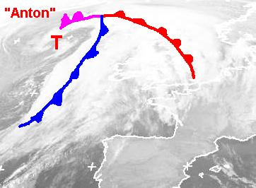Der Bildausschnitt zeigt das Tief 'Anton' mit seinem Zentrum bei Island. Seine Warmfront erstreckt sich hier noch über Großbritannien. Im Laufe des Tages verlagert sie sich jedoch weiter nach Osten und bringt auch zu uns etwas Regen. (Bildquelle: NERC Satellite Receiving Station, Dundee University, Scotland, http://www.sat.dundee.ac.uk/)