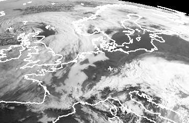 Deutschland liegt heute meist noch unter Hochdruckeinfluss. Im Südosten liegen allerdings noch die Wolken von Tief 'Bernd' über Südosteuropa. Im Nordwesten von Deutschland hat sich am Morgen gebietsweise Hochnebel gebildet, der sich meist aber schon wieder aufgelöst hat. Bei SChottland liegt das Zentrum von Tief 'Carsten'. Die Wolken seines Frontensystems ziehen nun ebenfalls nach Deutschland und werden am Abend und in der Nacht im Norden schon ersten Regen bringen. (Bildquelle: NERC Satellite Receiving Station, Dundee University, Scotland, http://www.sat.dundee.ac.uk/)
