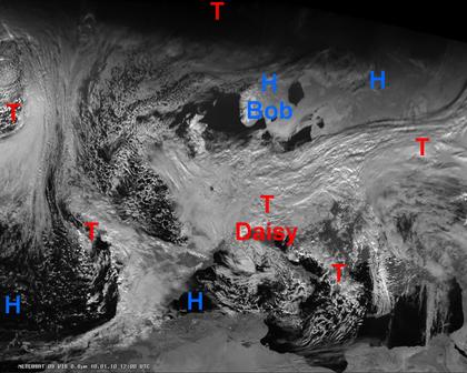 Auf der Satellitenbildaufnahme von heute Nachmittag liegt Europa vielfach unter einer geschlossenen Wolkendecke. Das kräftige Tief 'Daisy' sorgt vor allem in Mittel- und Osteuropa für häufige, gebietsweise auch ergiebige Schneefälle. Von der Adria bis zur Ägäis sorgt ein weiteres Tief für teils starke Bewölkung und einzelne Schauer, teils auch für kräftige Gewitter. Die Iberische Halbinsel wird ebenfalls von einem Tiefdrucksystem überquert, dabei fällt vor allem in Südwestspanien teils kräftiger Regen. Freundlicher ist es unter Hochdruckeinfluss in Nord- und Nordosteuropa, hier fällt nur vereinzelt etwas Schnee, teils ist es aber trüb.