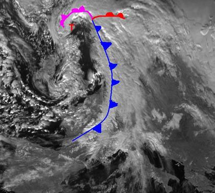 Auf dem Satellitenbild von Samstag Mittag sind die Ausläufer von Tief 'Hans' bei Schottland gut zu erkennen. Sie sorgen heute für dichte Wolken und Regen von Skandinavien über Deutschland bis in den Süden Frankreichs. Weiter im Osten ist es unter leichtem Hochdruckeinfluss eher freundlich und trocken.