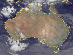 Das Wetter in Australien ist derzeit in zwei Regionen durch teils kräftige Schauer oder Gewitter geprägt: Zum einen im tropischen Norden, aber auch im Südwesten, wo ein Tiefdruckgebiet mit seinem Wirbel Wolken ins Landesinnere lenkt. Sonst findet man über dem Kontinent nur wenige Wolken.