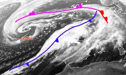Auf dem Atlantik liegt Tief 'Jakob'. Seine Warmfront zieht heute mit etwas Regen über Deutschland hinweg. Morgen wird uns die Kaltfront mit ihrer Bewölkung überqueren. Dann kann es sogar etwas mehr regnen als heute.
