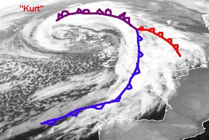 Die Ausläufer des Tiefs 'Kurt' bei Island erstrecken sich von Island über die Britischen Inseln bis in die Biskaya. Schön zu erkennen sind die einzelnen Schauer über dem Atlantik, die sich in den kühleren Luftmassen hinter der Kaltfront bilden.