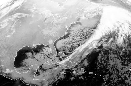 Bei Neufundland liegt das Tief 'Reineke', das am Mittwoch Regen und kräftigen Wind nach Deutschland bringt. Man erkennt die Bewölkung seiner ausgeprägten Kaltfront, die bis in die Karibik reicht. Auf seiner Rückseite zeigt sich über den USA unter Hochdruckeinfluss kaum Bewölkung. Nur an den großen Seen und in den Appalachen findet man noch einige Schneeschauer. Wo die Kaltluft vom Kontinent auf das Meer strömt bildet sich aber bald Schauerbewölkung, die zum Beispiel in Kuba zu Regenschauern führt.
