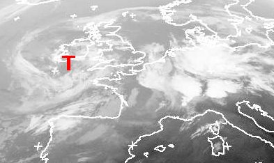 Das Zentraltief 'Steve' über Irland lenkt mit einer westlichen Strömung feucht-kühle Luft nach Mitteleuropa. Über der Ostsee hat sich das Randtief 'Thies' gebildet, dessen Wolken heute für erheblichen Niederschlag in Deutschland sorgen.