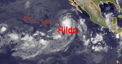 Auf dem Satellitenbild zeigt sich der Tropensturm 'Hilda' über dem östlichen Pazifik in einigen 100 Kilometer Entfernung zum mexikanischen Festland. Zur Zeit erreicht der Wirbelsturm, der sich auf einer westlichen Zugbahn befindet, mittlere Windgeschwindigkeiten von etwa 100 km/h. Er wird sich in den nächsten Tagen bis zum Wochenende aber voraussichtlich noch weiter verstärken und ab Donnerstag auch zum Hurrican der 1. Kategorie heraufgestuft werden.