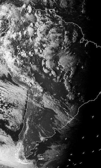 Kurz vor Sonnenuntergang erkennt man über dem zentralen Südamerika zahllose einzelne Schauer und Gewitter. Aber auch in den Anden und zwischen Paraguay und Südbrasilien fallen Schauer. Weiter im Süden ist es unter Hochdruckeinfluss freundlich. Erst in Südchile findet man Regenwolken, die sich an der Westseite der Anden stauen.