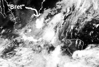 Im Süden Mexikos hat sich ein tropischer Sturm (mit Namen 'Bret') entwickelt, der sich zur Zeit im Golf von Mexiko nahe der Mexikanischen Küste aufhält und weiter nach Nordwesten zieht. Zur Zeit erreicht er Windgeschwindigkeiten von 65, in Böen 84 km/h und soll sich noch weiter verstärken. Berechnungen zufolge soll er am Donnerstag morgen nahe der Stadt Tuxpan wieder auf die Mexikanische Küste treffen und sich dann etwas abschwächen.