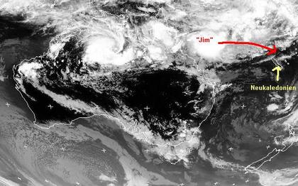 In der Korallensee, nordöstlich von Australien hat sich der tropische Sturm 'Jim' aufgewirbelt. Zur Zeit erreicht er Windgeschwindigkeiten von 84, in Böen 100 km/h und zieht Richtung Osten. Berechnungen zufolge soll er sich noch weiter verstärken und am Dienstag in die nähe der Insel Neukaledonien gelangen. Sein Endziel ist noch unklar.