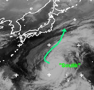 Der tropische Sturm 'Soulik' liegt derzeit über den nördlichen Marianen im Pazifik. Zurzeit beträgt seine Spitzenwindgeschwindigkeit in Böen etwa 150 km/h. In den nächsten Tagen wird der Sturm sehr wahrscheinlich zum Taifun hochgestuft. Berechnungen zufolge soll er noch etwas weiter nach Nordwesten ziehen und dann nach Nordosten abdrehen. Ob die Ausläufer des Sturms auch Japan erreichen ist noch unklar.