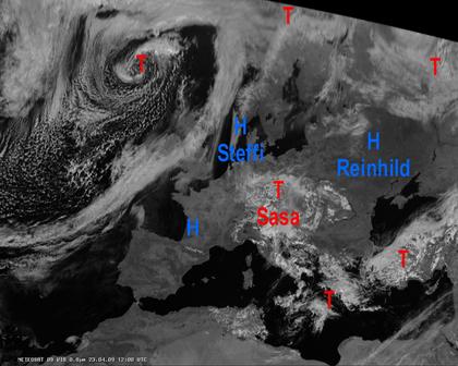 Auf dem Satellitenbild von heute Nachmittag ist das Tief 'Sasa' über Polen zu erkennen, das heute besonders im Osten und Südosten Deutschlands für vielfach dichte Wolken und Schauer gesorgt hat. Desweiteren befinden sich Tiefdruckgebiete über dem zentralen Mittelmeer, der Türkei und bei Island. Hierbei kommt es meist zu einzelnen Schauern. Von Italien bis Griechenland und teils auch in der Türkei kann es auch zu örtlichen Gewittern kommen. Sonst ist es in Europa unter Hochdruckeinfluss überwiegend freundlich und oft auch sehr sonnig.