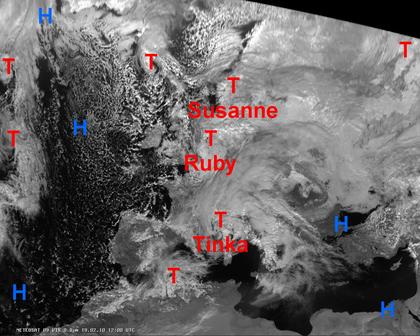 Auf dem heutigen Satellitenfoto sorgen Tiefdrucksysteme vor allem vom westlichen Mittelmeer, über Frankreich und Italien, weite Teile Mitteleuropas bis nach Nordskandinavien für vielfach dichte Bewölkung und zeitweiligen Regen, im Norden auch für Schnee. Am freundlichsten und meist trocken ist es im östlichen Mittelmeerraum und zu einem Großteil auch auf der Iberischen Halbinsel.