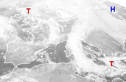 Zwei Tiefdruckgebiete sorgen mit ihren Ausläufern für viele Wolken und etwas Regen in Mittel- und Westeuropa. Vom Baltikum bis zum Schwarzen Meer breitet sich dagegen Hochnebelartige Bewölkung aus. Hier bringt ein Hoch über Russland ruhiges, aber meist trübes Winterwetter. (Bildquelle: NERC Satellite Receiving Station, Dundee University, Scotland, http://www.sat.dundee.ac.uk/)