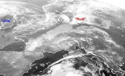 Ein Tiefdrucksystem, mit den Tief 'Rudi' über Polen und einem kleinen Tief über den Alpen, bringt Regen und teils gewittrige Schauer in weite Teile von Mitteleuropa. Über Irland und Schottland sorgt Hoch 'Jola' schon für einen fast wolkenfreien Himmel, und auch auf dem Balkan und auf der Iberischen Halbinsel sind nur wenige Wolken vorhanden.