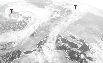 Zwei Tiefdruckgebiete bestimmen das Wetter in Europa. Während die Ausläufer von Tief 'Susann' über dem Baltikum meist nur noch für dichte Wolken sorgen, bringen die Ausläufer von Atlantiktief 'Rosa' teils kräftigen Regen und Wind, vor allem in den Westen und auch nach Deutschland. (Bildquelle: NERC Satellite Receiving Station, Dundee University, Scotland, http://www.sat.dundee.ac.uk/)