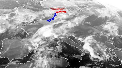 Während zunehmender Hochdruckeinfluss über der Iberischen Halbinsel für meist freundliches Wetter sorgt, bringen Tiefausläufer wechselhaftes und wolkenreiches Wetter in weite Teile Europas. Auf dem Satellitenbild von Sonntag früh erkennt man das kleine Tief 'Gunther' über der Ostsee. Seine Kaltfront überquert heute den Norden Deutschlands und bringt kühlere Luftmassen mit sich. Von Südfrankreich bis Polen erstrecken sich die Reste eines Ausläufers von Tief 'Franci' über Russland. Auch sie sorgen heute noch für zeitweiligen Regen, in Südfrankreich sogar für Gewitter.