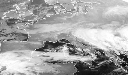 Von der Bretagne über Süddeutschland bis nach Polen erstreckt sich ein breites Wolkenband. Es bildet die Kaltfront eines Tiefs über Nordrussland. Hinter der Front strömt feuchtkalte Luft aus nordöstlicher Richtung nach Deutschland. Durch diese Strömung stauen sich die Wolken vor den Alpen, und sorgen dort für zum Teil lang anhaltenden Schneefall. Im Norden Deutschlands bilde sich einzelne Schauer.