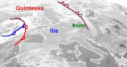 Ein Tiefdrucksystem erstreckt sich von den Britischen Inseln bis nach Skandinavien und sorgt im Nordwesten verbreitet für wolkenreichen Himmel. Über Ostdeutschland und Polen liegt die Okklusion von Tief „Quintessa“ mit Zentrum nördlich von Schottland. Von Frankreich bis nach Westdeutschland konnte sich Zwischenhoch „Ilie“ mit freundlichem Wetter durchsetzen. Über Irland liegt ein Randtief mit dichten Wolken und Regen, die am Sonntag Nachmittag auch Westdeutschland erreichen.(Bildquelle: NERC Satellite Receiving Station, Dundee University, Scotland, http://www.sat.dundee.ac.uk/)