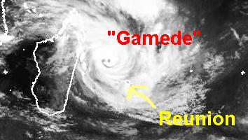 Auf dem Satellitenbild von Montag früh befindet sich der Zyklon 'Gamede' zwischen Madagaskar und der Insel Reunion. Zurzeit erreicht er mittlere Windgeschwindigkeiten von 185, in Böen 231 km/h, und soll sich noch etwas verstärken. Berechnungen zufolge zieht er zwischen den Inseln nach Südwesten, sein Endziel ist allerdings noch unklar. (Bildquelle: NERC Satellite Receiving Station, Dundee University, Scotland, http://www.sat.dundee.ac.uk/)