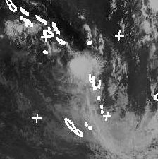 Westlich von Vanuatu liegt der Zyklon 'Yani' mit einer mittleren Windgeschwindigkeit von nur noch 55km/h und Böen bis 75 km/h. Damit hat er sich deutlich abgeschwächt. Er wird sich nun voraussichtlich auflösen. (Bildquelle: NERC Satellite Receiving Station, Dundee University, Scotland, http://www.sat.dundee.ac.uk/)