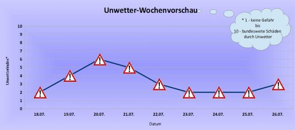 In der kommenden Wetterwoche starten wir zunächst noch verbreitet mit ruhigem und oft auch freundlichem Wetter. Noch während der ersten Wochenhälfte steigt jedoch das Risiko von Schauern und Gewittern insgesamt langsam, aber stetig an. Besonders am Mittwoch und Donnerstag ist mit lokal starken Gewittern zu rechnen, bevor die Gefahren durch Unwetter im weiteren Verlauf wiederum deutlich zurück gehen und voraussichtlich auch zu Beginn der übernächsten Woche gering bleiben.