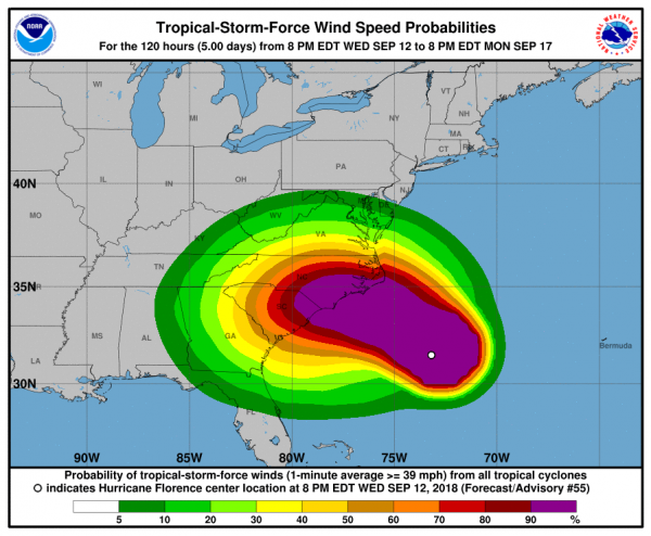 'Florence' leicht abgeschwächt, dennoch enorme Schäden und wochenlange Stromausfälle an der Ostküste der USA zu erwarten.