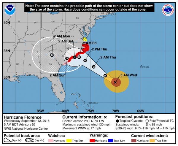 Das Nationale Hurrikan Zentrum (NHC) warnt zudem vor sintflutartigen Regenfällen und Sturmfluten in den besonders betroffenen Staaten North Carolina, South Carolina und Virginia. Hier laufen die Evakuierungsmaßnahmen bereits auf Hochtouren, etwa 1,7 Millionen Menschen sind betroffen. Enorme Sachschäden, zerstörte Infrastruktur und Stormausfälle über einen längeren Zeitraum gelten in den Küstenstaaten schon jetzt als äußerst wahrscheinlich.