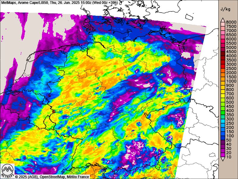 Folgend die CAPE/LIFTED-Index Karte für den Donnerstag nach Arome und die 3-Stunden-Regenkarte bis Donnerstagnachmittag (15:00 Uhr).