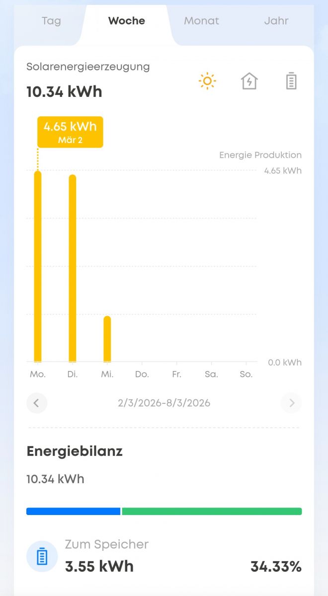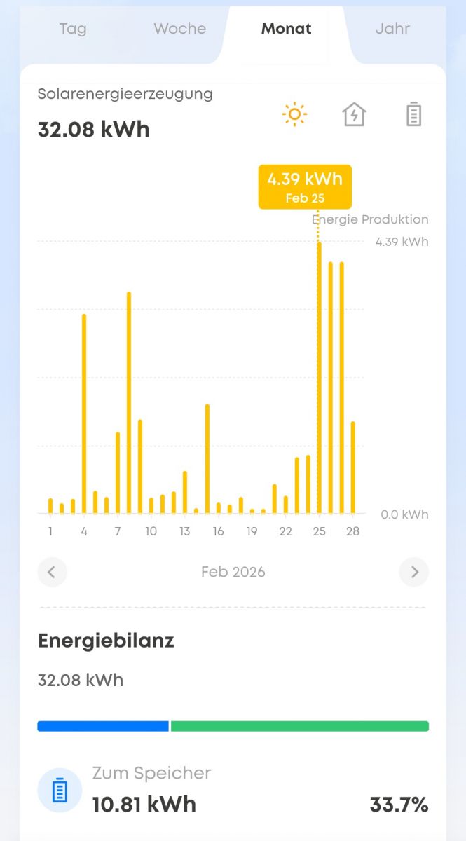In unserem Beispiel wurde bis März bei wenig Sonnenschein durchschnittlich etwa 5–6 kWh Netzstrom pro Tag benötigt.
