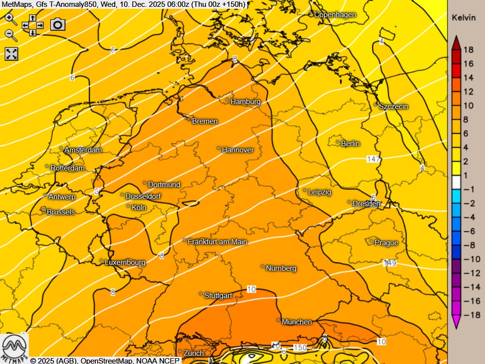 Die Temperaturabweichungen für Mittwochmorgen (06:00 Uhr) für Europa und Deutschland) nach GFS:
