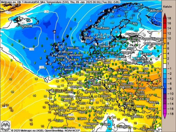 So könnte die Luftmassengrenze am Donnerstag nach dem GFS-Modell verlaufen.