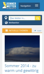 Als eine der ersten großen Wetterseiten haben wir Donnerwetter.de komplett auf ein flexibles Design umgestellt: Die neue Seite passt sich an, je nachdem ob Sie sie vom Handy, Tablet oder eben vom PC auf dem Schreibtisch aufrufen. So finden Sie auf vielen Tablets unser Haupt-Auswahlmenü als Zeile über der Seite, auf Handys ist es rechts oben über einen Button ausklappbar. Die Wetter- und Ortssuche finden Sie auf jeder Seite. Navigationselemente wie zum Beispiel der Wechsel zum nächsten Tag der Wettervorhersage sind über größere Schaltflächen auf Touch-Displays nun einfacher zu bedienen.