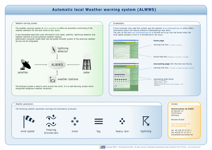 Das System sammelt die aktuellen Wetterdaten und analysiert automatisch die Wetterentwicklung der nächsten Stunden. Die Eigenentwicklung der Donnerwetter.de GmbH kann weltweit vor gefährlichen Wettererscheinungen warnen und somit helfen Menschenleben zu retten. Und das nicht nur in der Theorie, sondern schon seit einigen Monaten auch praktisch: Auf der Internetseite www.siebengebirge.de werden Besucher des Naturparks Siebengebirge bei Bonn zeitnah über mögliche Gefahren informiert.