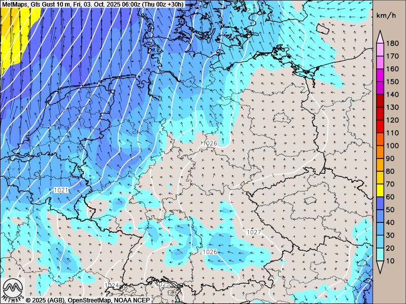Die Wetter- und Bewölkungskarte für Freitagnachmittag sowie die Böen- und Temperaturkarte für Freitagfrüh nach GFS: