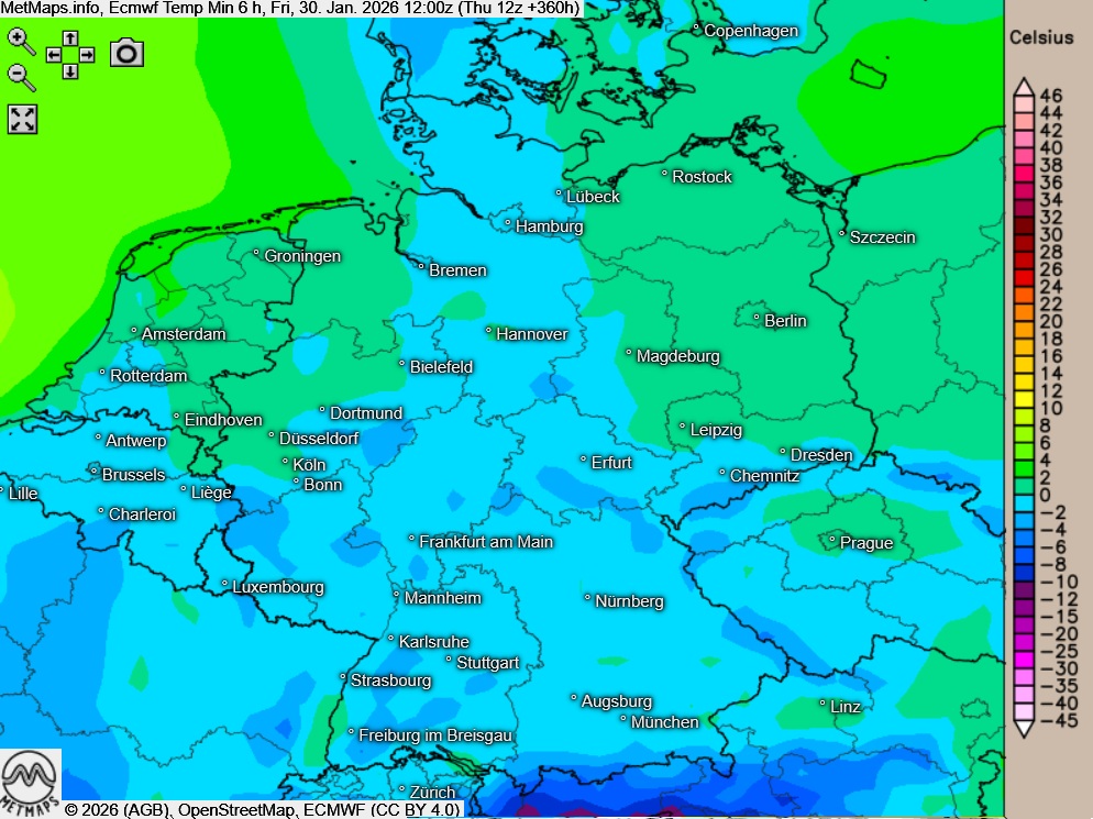 Zum direkten Vergleich hier die Temperaturminima für den 30.01.2026. Die erste Karte zeigt die Berechnung nach GFS, die zweite den ECMWF-Lauf: