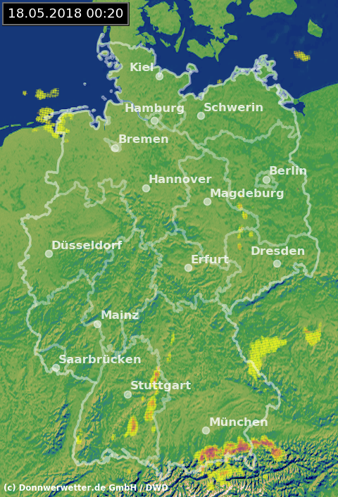 Das Radarbild zeigt aktuell im Süden, sowie an den Alpen noch einige Signale mit nach Süden ziehenden Regengüssen. Sonst präsentiert sich der Himmel über Deutschland teils wolkenverhangen, teils aufgeklart.