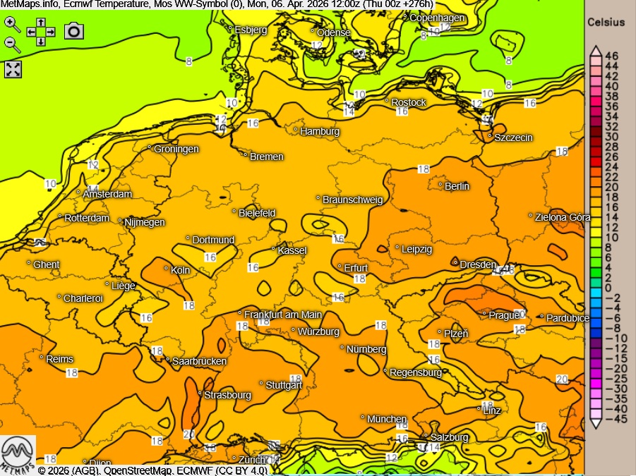 Besonders spannend: Am Ostermontag weit das Modell gebietsweise Temperaturen um 18 bis 20 Grad in den aktuellen Prognosen aus; lokal könnte es sogar noch etwas wärmer werden.