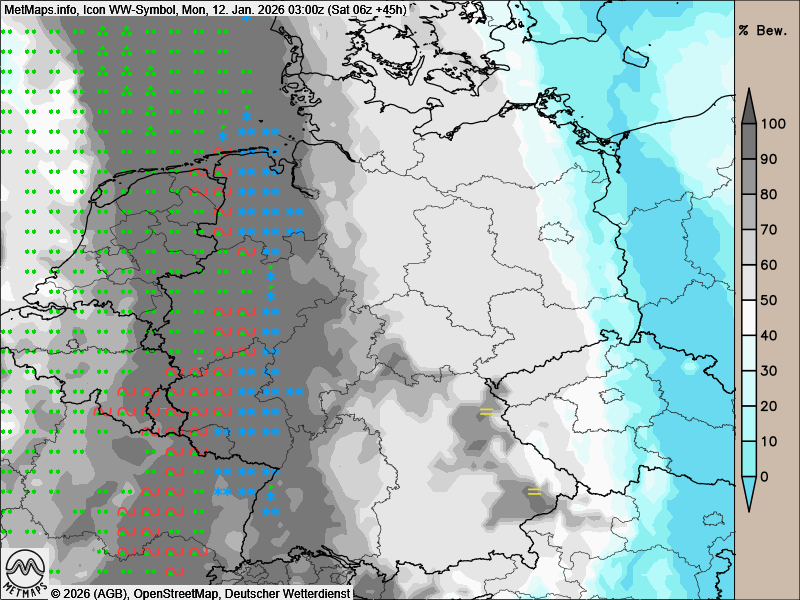 In der Nacht auf Montag breiten sich von der Nordseeküste bis in den Schwarzwald Schneefälle aus, stellenweise fällt auch gefrierender Regen. Dadurch können Straßen, Gehwege und andere Flächen verbreitet mit gefährlichen Eispanzern überzogen werden.
