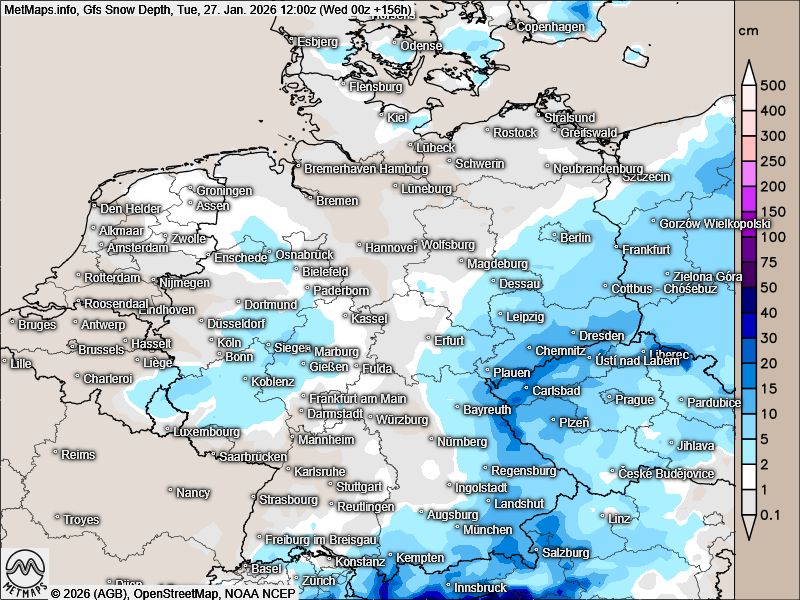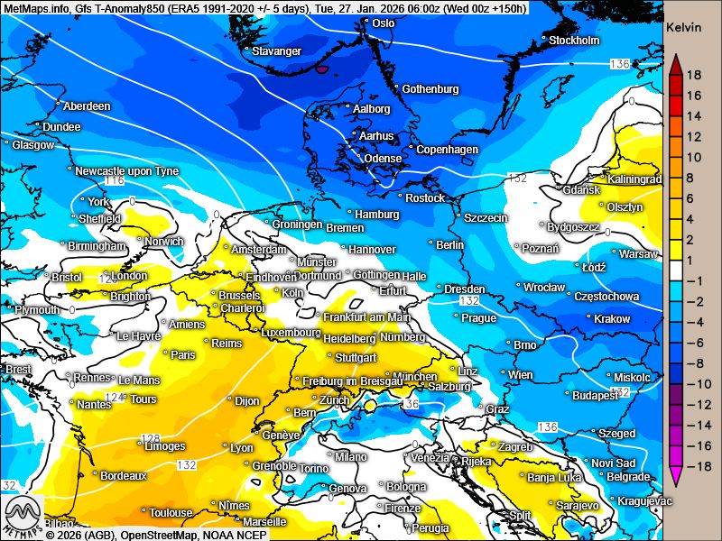 Vor allem das Wettermodell GFS berechnet eine markante Grenzlage über Mitteleuropa. Diese könnte Schnee, Eisregen und Regen bringen – begleitet von Temperaturunterschieden von teils über 10 °C in Mitteleuropa.