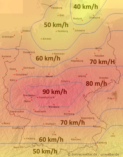 Die Karte zeigt die zu erwartenden Spitzenwindgeschwindigkeiten zwischen Donnerstag 22:00 Uhr und Freitag 12:00 Uhr: