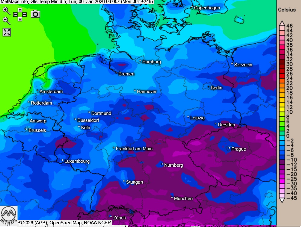 Bereits in der kommenden Nacht fällt in der Mitte sowie im Norden gebietsweise etwas Schnee. Die Temperaturen liegen dabei verbreitet zwischen minus 3 und minus 5 Grad, insbesondere in Richtung Sachsen und Bayern. In ungünstigen Lagen Baden-Württembergs können die Werte auf minus 10 bis minus 15 Grad sinken, im Alpenraum lokal sogar noch darunter.