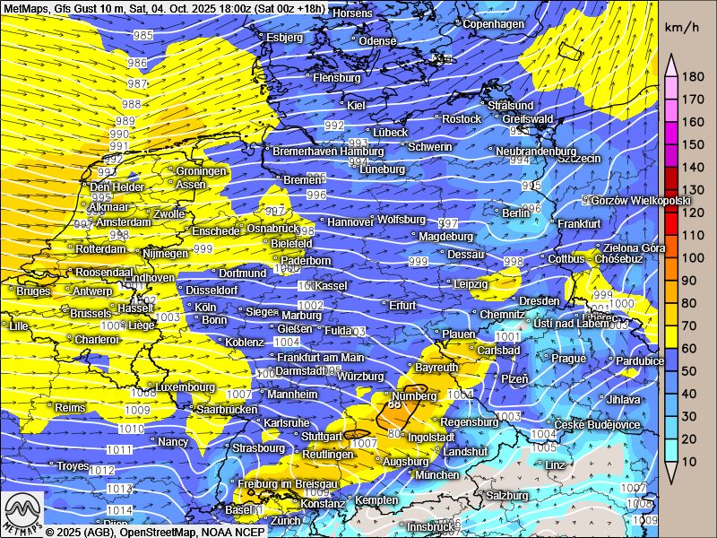 Am Nachmittag erreicht die Front dann dann auch die südlichen Landesteile mit Sturm.