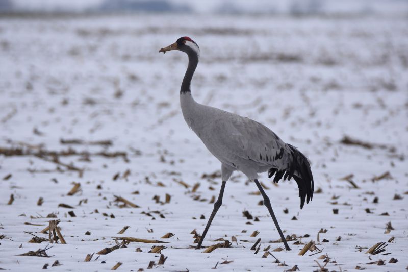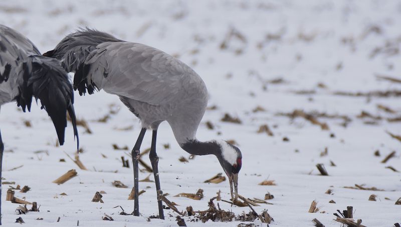 Nahrung finden die Kraniche unter anderem auf den abgeernteten Maisfeldern.