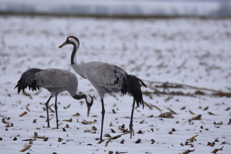 Ungewohntes Wetter, ungewohnte Bilder: In der Wetterau überwintern Kraniche im Schnee.