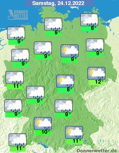 Winterfreunde sollten dennoch nicht verzagen - nach Weihnachten kann es wieder kalt werden, der Winter kommt bestimmt wieder. Heiligabend wird aber erst einmal grün - viele Wolken, Wind und Regen bestimmen den 24. Dezember im Land. Immerhin muss man sich um Straßenglätte keinen Kopf machen.