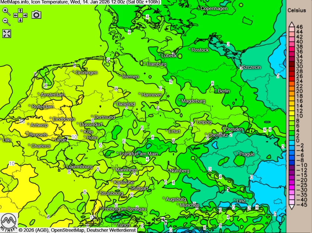 Die Milderung kommt zunächst in der Westhälfte an, bis zur Wochenmitte sind dann aber auch im Nordosten Deutschlands strenge Frostwerte erst einmal Geschichte. Im Westen sind Mitte kommender Woche dann sogar Temperaturen im zweistelligen Plusbereich möglich.
