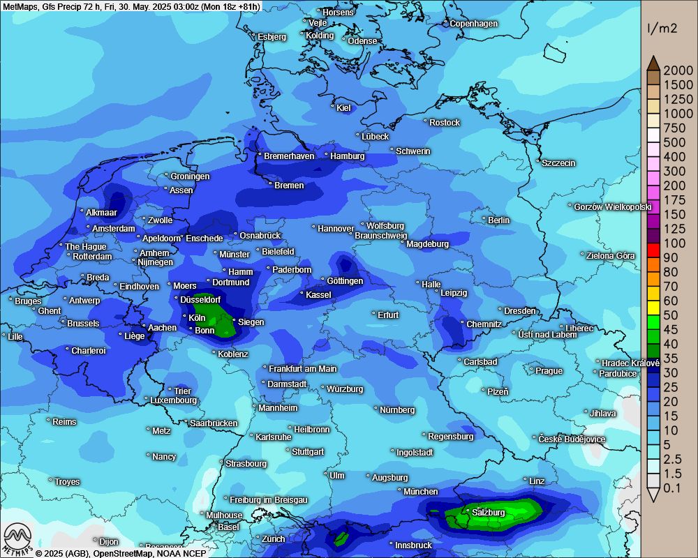 Die Tiefdruckgebiete "Peter" und "Ole" bringen heute und morgen nochmals Regen nach Mitteleuropa - bis zu 40 l/m² sind im Stau der Mittelgebirge möglich.